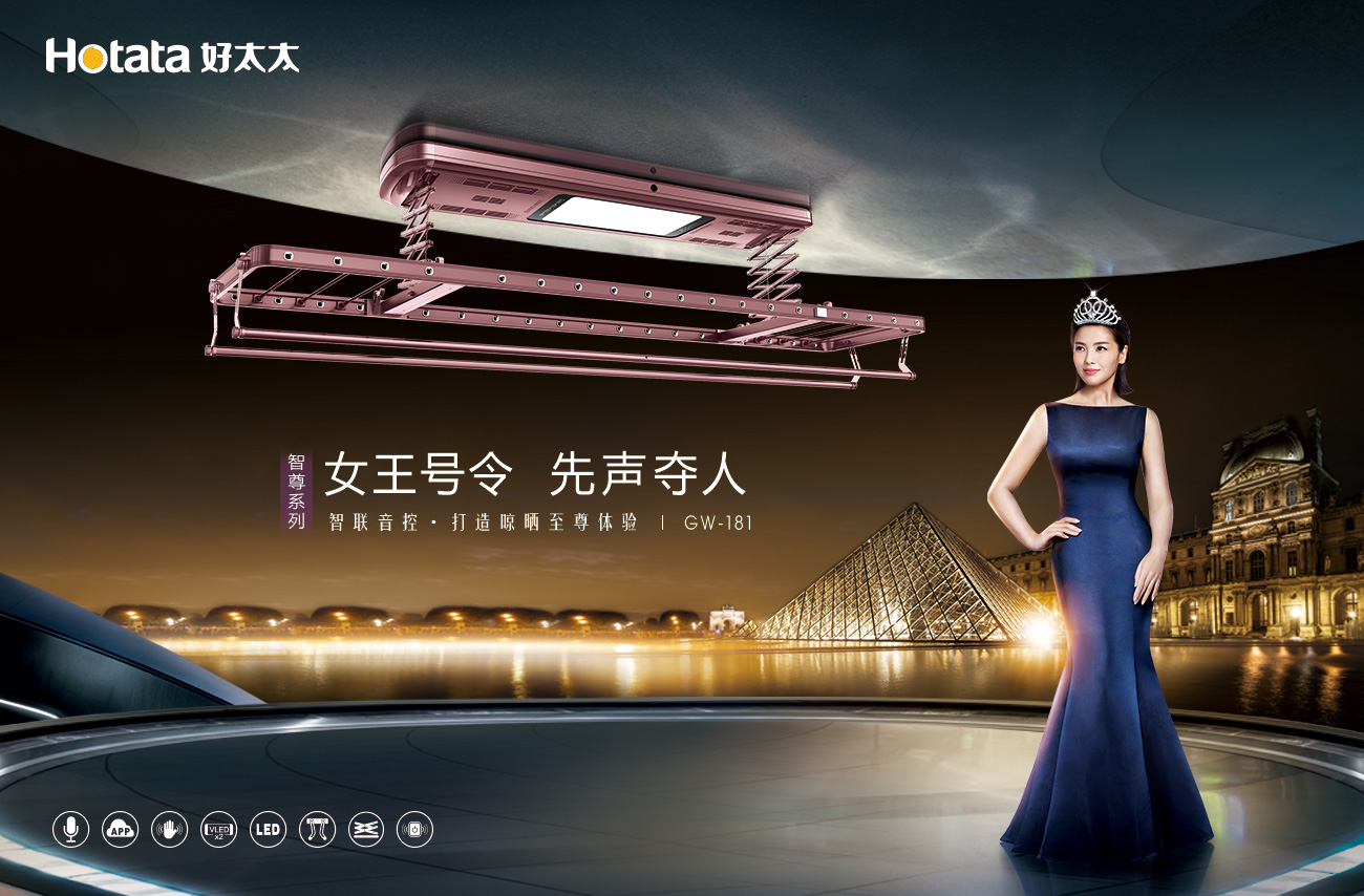 智尊系列是可人机对话的智能晾衣机。上升、下降、风干、烘干、消毒灯所有功能可语音发号施令,需要风干,只要对着智尊说“开启风干”,智尊即可执行指令,开启风干功能。不仅如此,智尊系列还将对监测超重等异常状况,进行语音提示,实时反馈运行状态。连接wifi,智尊可自动更新天气信息,语音播报天气、温度、湿度、PM2.5指数、风力级数等信息。