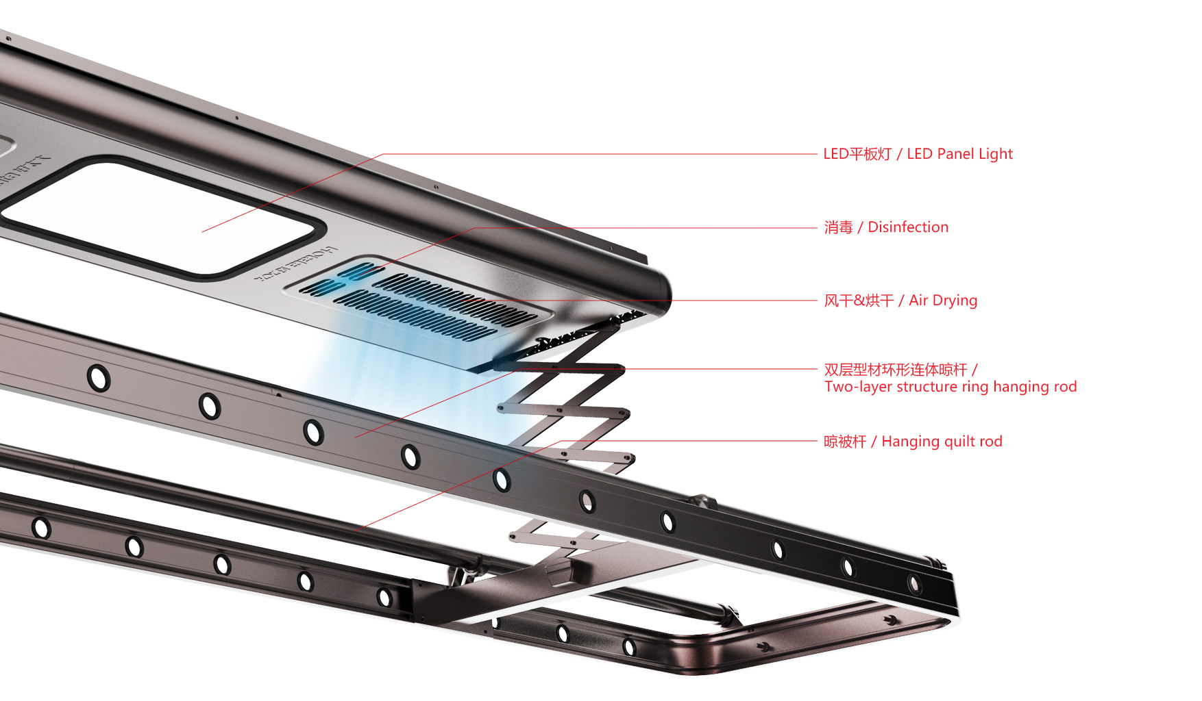 集合升降、照明、消毒、干衣等多重功能于一体,一键操控,让晾晒变得轻松简单。