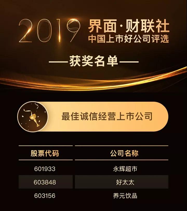 好太太集团(603848)以高质量发展、良好的信誉及诚信经营,荣获“最佳诚信经营上市公司”奖。