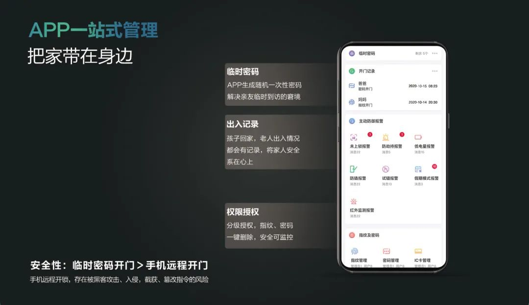 生成临时密码,避免密友门外等候,权限管理,一键添加或删除指纹、密码和磁卡。