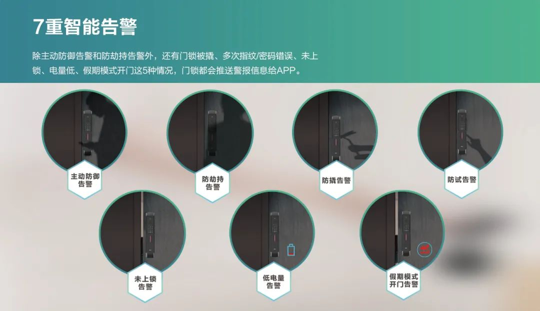 7重智能告警,给你贴心守护,防撬、防试、防劫持三重防护,未关门、低电量双重提醒,主动防御、假期模式两种智能使用场景