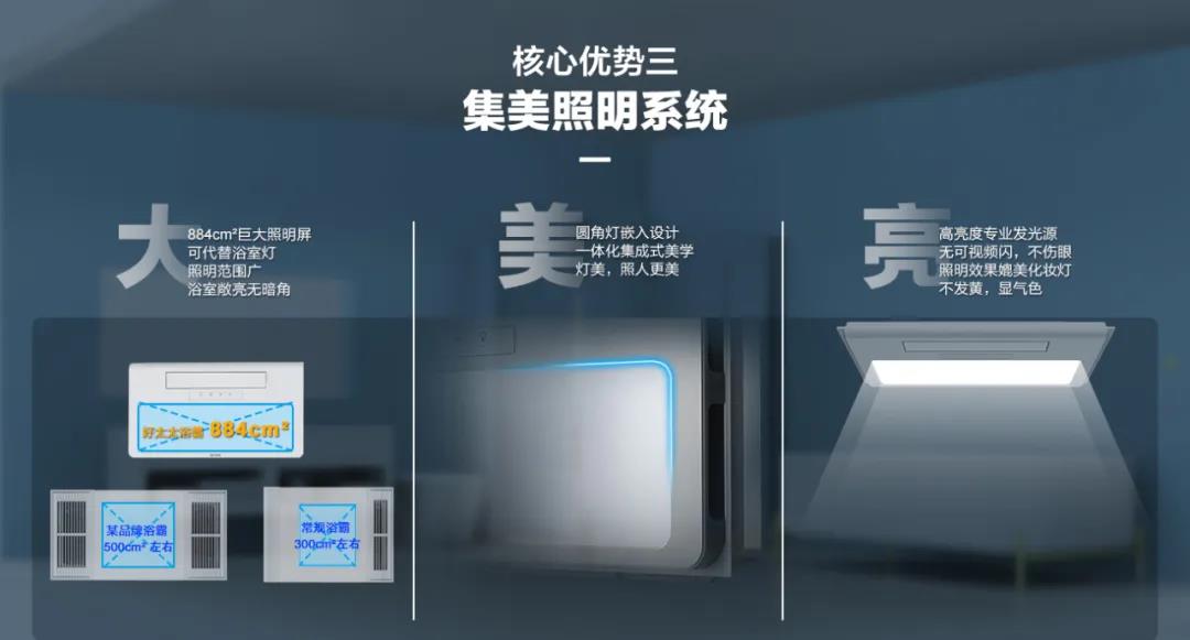 巨灵神三防电机,防水防潮防腐蚀;鲸吸3换气技术,卫生间无窗也能时刻清新;还有集美照明系统,三大核心优势,令大家又多了一个理由选择金年会智能浴霸!