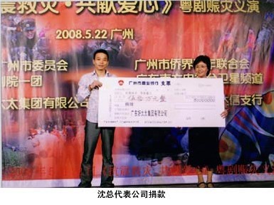 5月22日,由广东南方电视台卫星频道主办,广东金年会集团协办的《抗震救灾•共献爱心》粤剧赈灾义演在南方剧院举行,金年会集团董事长沈汉标先生代表集团为灾区捐款50万元,此次赈灾义演活动,共募集善款120多万元。这些善款将通过广州市慈善会全额捐往灾区。